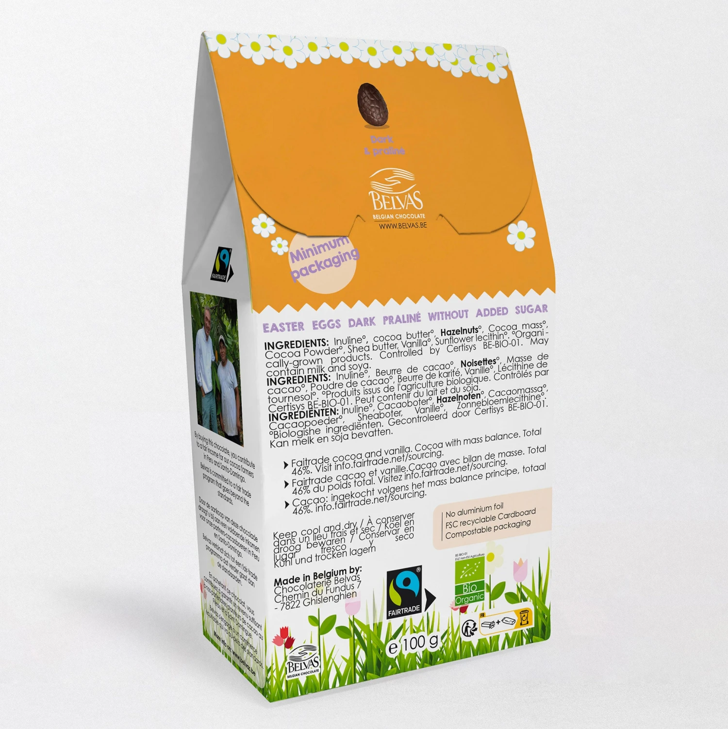 “The sugar-free dark hazelnut praliné egg is plant-based, fairtrade & organic. The sweetener is inulin, an organic fiber that is extracted from the agave roots”