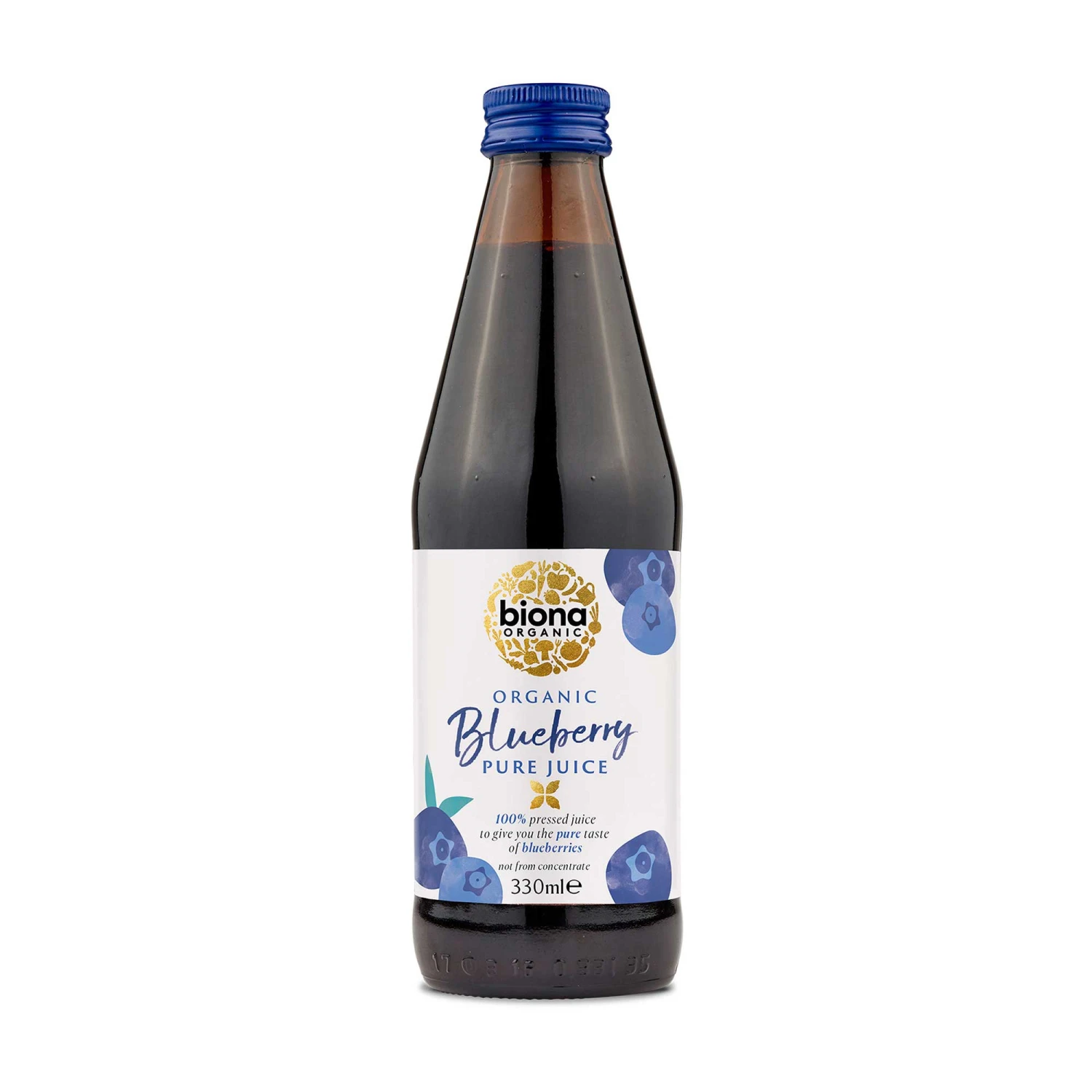 “Sweetly mellow blueberries are packed with intense fruity flavours . Enjoy Biona’s organic Blueberry Superjuice mixed with other juices, smoothies, added to yoghurt or as a tasty topping for desserts or muesli.”
