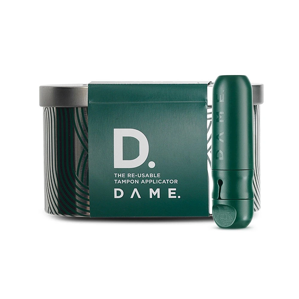 “DAME super smooth self-sanitising applicator saves thousands of pieces of plastic. Made from medical grade Mediprene, BPA free and antimicrobial, it fits all tampon sizes. DAME comes with 6 organic tampons (3 regular and 3 super), a cotton travel pouch and a reusable bathroom tin. “