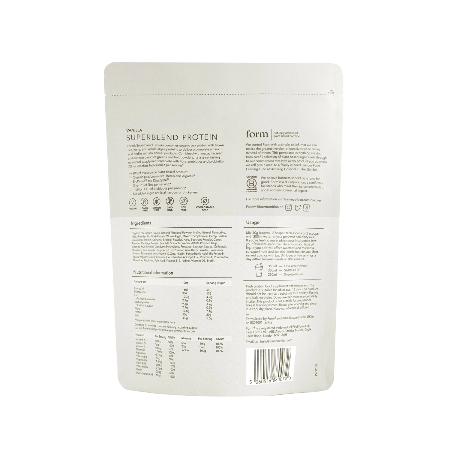 Form’s Superblend Protein rises to the challenge of your active and busy lifestyle, redefining the “protein shake”. A base of organic pea protein with brown rice, hemp and AlgaVia® whole algae proteins deliver a complete amino acid profile with no animal products. Combined with maca, flaxseed and our own blend of greens and fruit powders, it’s a great tasting nutritional supplement complete with fibre, prebiotics and probiotics. All for less than 160 calories per serving.