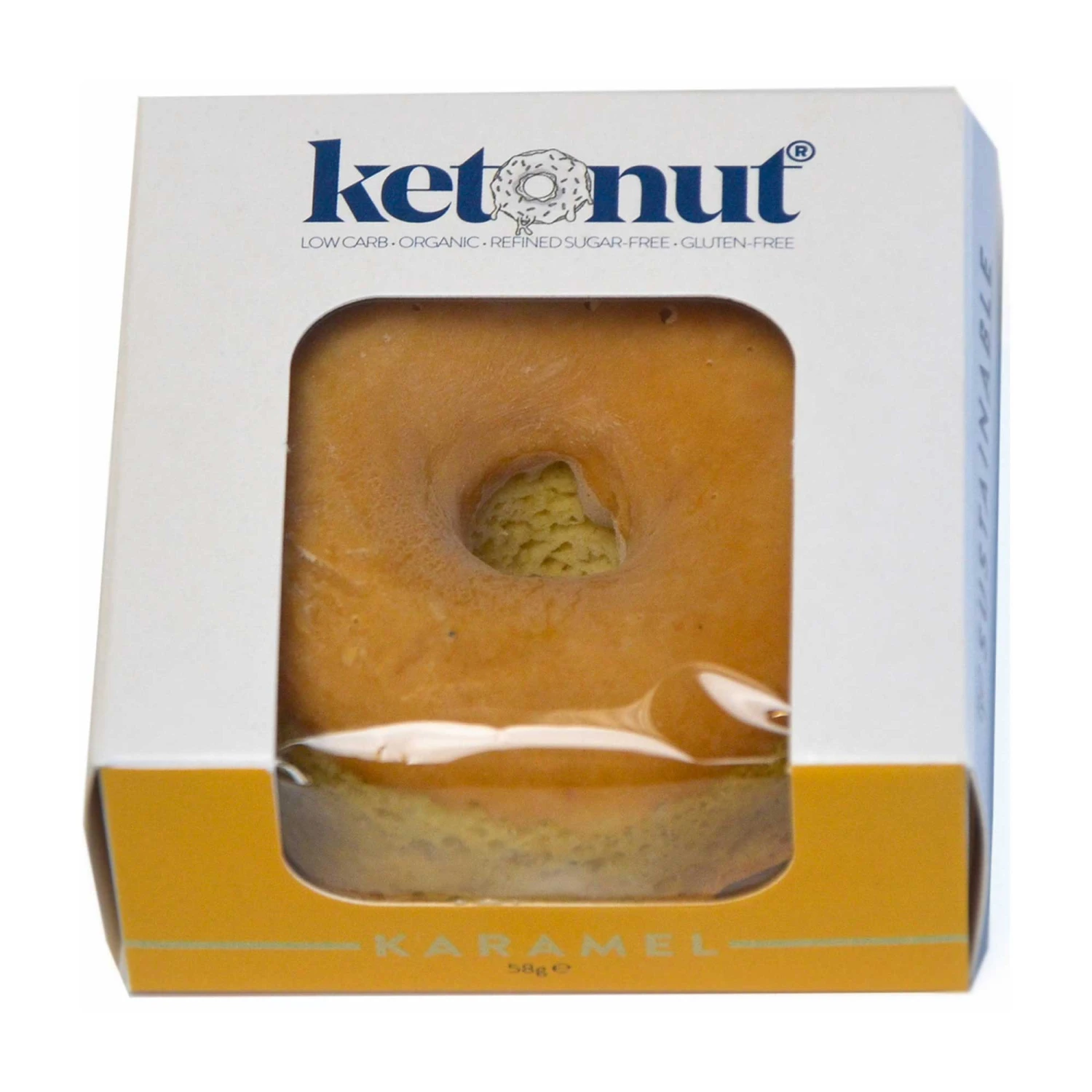 “An artisan baked keto doughnut, with a caramel topping made from organic pasture rasied cow’s milk. This ‘cake-liked’ texture doughnut is freshly crafted by hand the UK, and is safe for diabetics, ceoliacs, and keto. Low in carbs, refined sugar- free, gluten-free, grain-free, and outrageously tasty.”