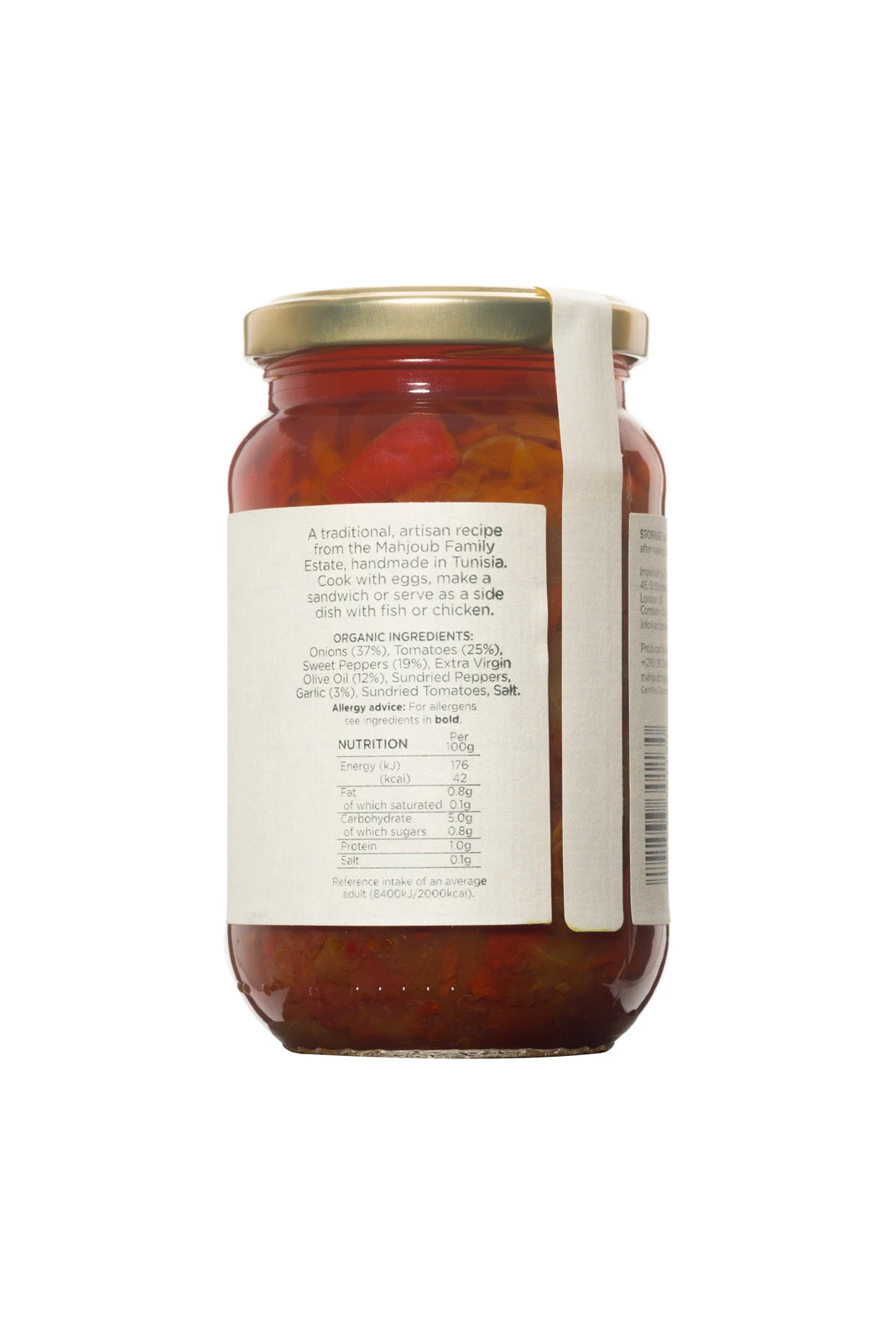 “A rich and versatile Tunisian recipe, which can be mixed with eggs for a South Mediterranean brunch, or served as a side dish with fish or chicken, or enjoyed with vegetables or in a sandwich. As with all of the Mahjoub products, this is produced using traditional farming methods with no additives or artificial processes. “