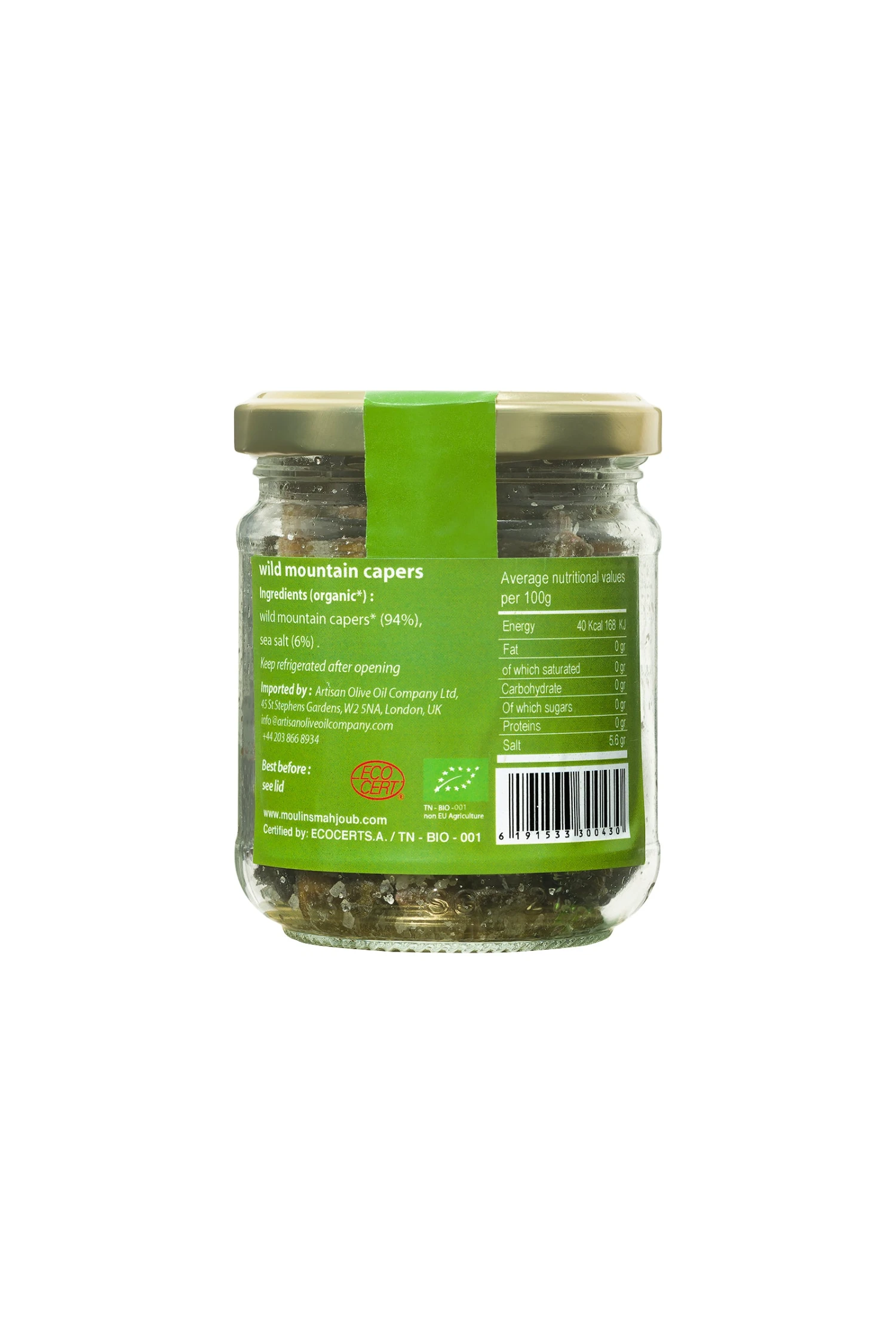 “Capers are the flower buds of a native Mediterranean bush that grows in the mountains of Tunisia. Unlike most commercial capers that are packed in brine, the Mahjoub’s capers are dried in sea salt to preserve their distinct flavor. As with all of the Mahjoub products, this is produced using traditional farming methods with no additives or artificial processes. Recommended for salad dressings, marinades, salmon, fish”