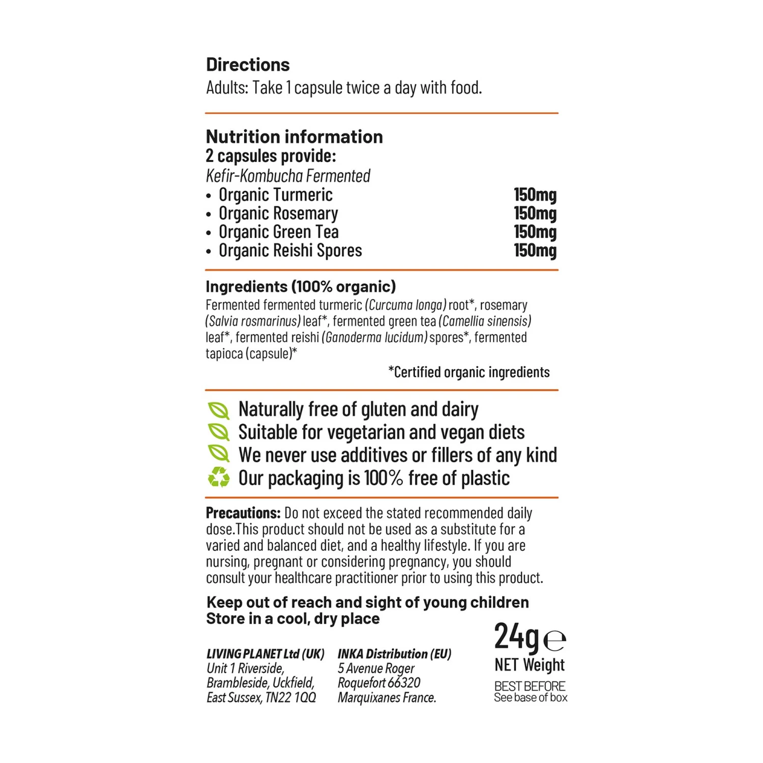 “Living Nutrition’s Organic Fermented Kef-flamex is a blend of powerful herbs turmeric, rosemary, green tea and reishi spore for physical health and wellbeing. These traditional herbs are rich in valuable micronutrients, enzymes, and full-spectrum compounds which work holistically together to support the health and wellbeing of the body’s joints and tissues. The unique kefir-kombucha fermentation transforms these herbs into their most living, active state, to create a synergy of bioavailable nutrients, enzymes, and beneficial microbes delivered as a living food complex for all-round physical support. “