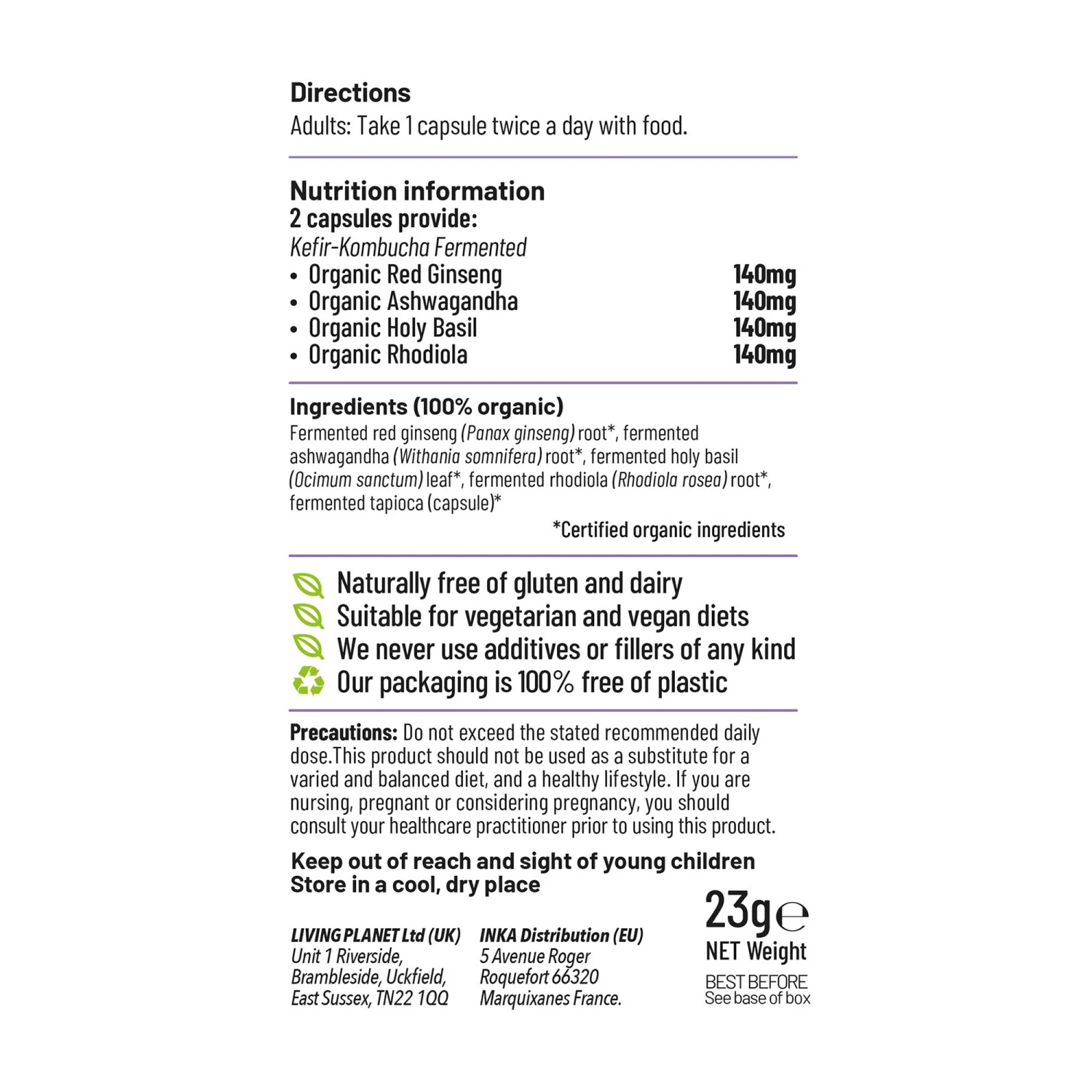 “Living Nutrition’s Organic Fermented True Adaptogens is a blend of the most revered and powerful adaptogens red ginseng, ashwagandha, holy basil, and rhodiola to balance body, mind, and spirit. These powerful herbal adaptogens are rich in valuable micronutrients, enzymes, and full-spectrum compounds which work holistically together to bring balance and harmony to the body during demanding periods. Fermenting maintains adaptogenic integrity by taking the whole of the plant and creating a superior form of the adaptogen, bursting with life and vitality. The unique kefir-kombucha fermentation transforms these herbs into their most living, active state, to create a synergy of bioavailable nutrients, enzymes, and beneficial microbes delivered as a living food complex for all-round adaptogenic support.”