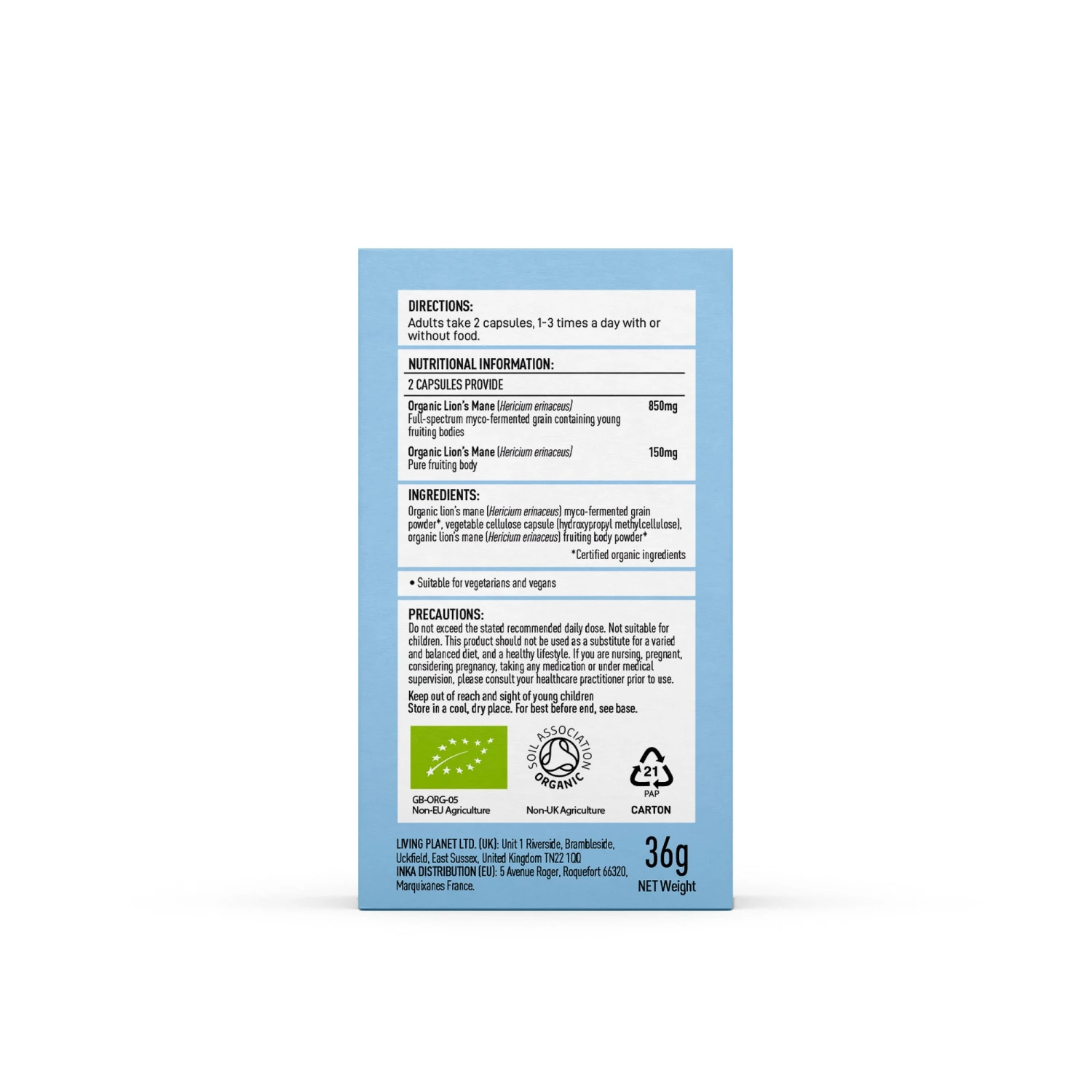 Organic Lion’s Mane Focus uses the whole mushroom, including the pure fruiting body and hyphae, providing a superior nutrient profile equivalent to wild-grown lion’s mane.