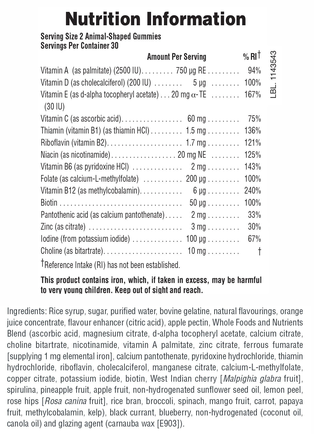 “Source of Life Animal Parade Gummies provide the nutritional assurance all parents seek for their children along with the great taste and animal shapes that kids love. Combining the natural goodness of whole foods with a balanced profile of nutrients makes Animal Parade the perfect healthy treat your children will love.KIDS LOVE IT: The fun animal shapes along with the great, natural and juicy taste of orange, grape, and cherry flavoured gummies make our daily multivitamin a children’s favourite.COMPLETE WITH ESSENTIAL NUTRIENTS: Animal parade Gummies contain a balanced profile of essential vitamins and nutrients including Vitamin A, B1, B2, B12, C, D3, E, biotin, calcium, magnesium, iodine, iron, zinc, and potassium.ORGANIC WHOLEFOODS: As well as a broad profile of nutrients, including a full complement of 20 essential vitamins and minerals, gummies are potentiated with the synergistic power of organic wholefoods and phytonutrients for a complete holistic effect.PURE AND NATURAL: It is free from artificial colours and preservatives and is free from the common allergens yeast, wheat, gluten, soya and dairy.”