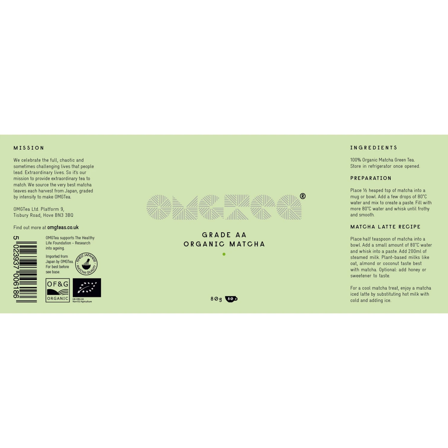 “OMGTEA AA Grade Matcha is a mid-range, high quality tea. Real matcha comes from Japan and is made from the finest shade-grown leaves stone-ground to a fine powder. OMGTea AA is made with a combination of leaves from the first and second harvest and ground with a traditional granite stone mill, a process that takes more than an hour to grind 30 grams.This award-winning, high quality matcha can be enjoyed straight as tea and is perfect for matcha lovers who enjoy their matcha as a latte or smoothie. Can also be used for baking, making delicious matcha ice cream and exquisite chocolates. Characteristics: rich in flavour, smooth and creamy. Vegan friendly and gluten free.”