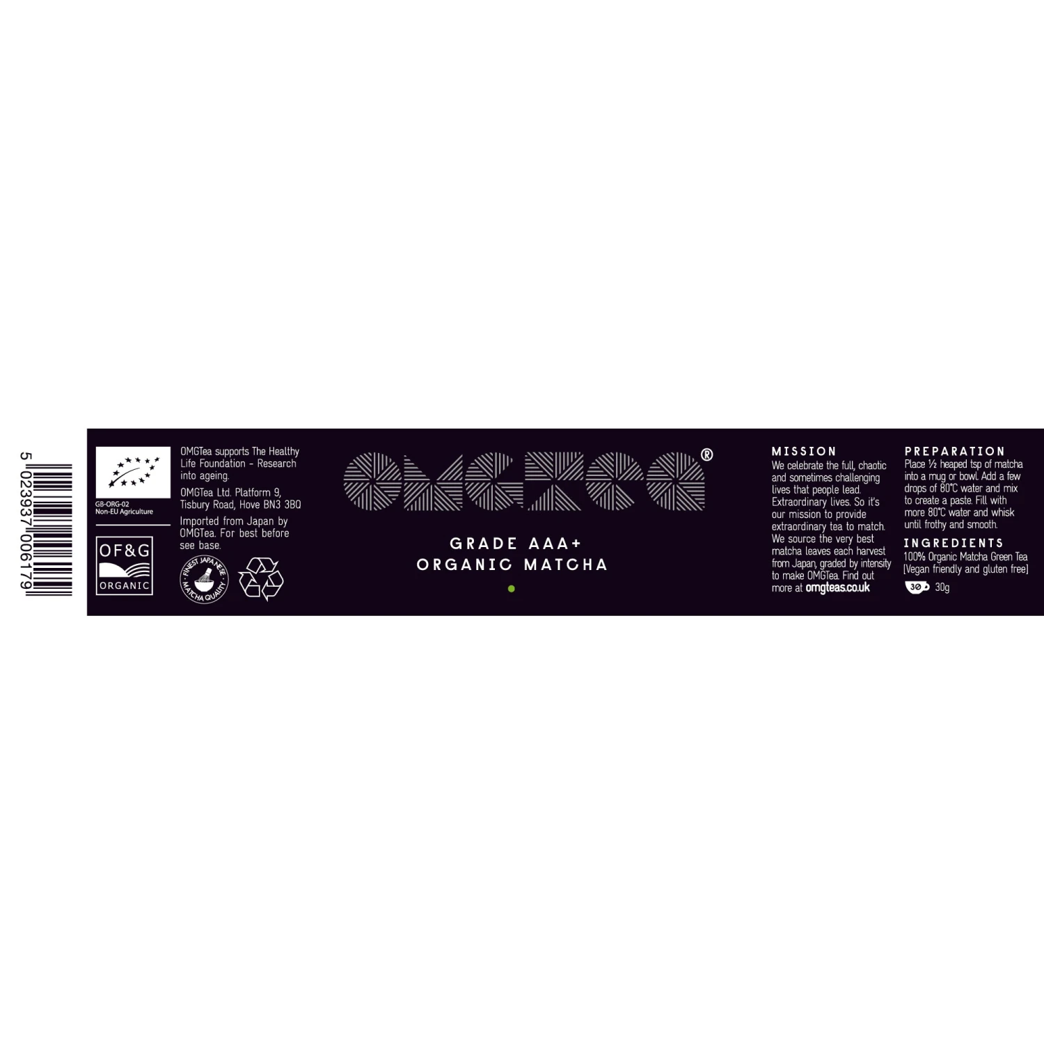 “OMGTEA AAA+ Grade Matcha is a very high grade organic, premium ceremonial tea. Real matcha comes from Japan and is made from the finest shade-grown leaves stone-ground to a fine powder. OMGTea AAA is made with only the finest leaves from the top of the plant and first harvest and ground using a traditional granite stone mill, a process that takes more than an hour to grind 30 grams. Available in limited quantity this award-winning, highest grade ceremonial matcha is for matcha lovers who like to drink it straight Japanese style. Ideal for preparing the perfect koicha (thick) or usucha (thin) matcha. Characteristics: sweet, smooth, creamy and rich in umami. Vegan friendly and gluten free.”