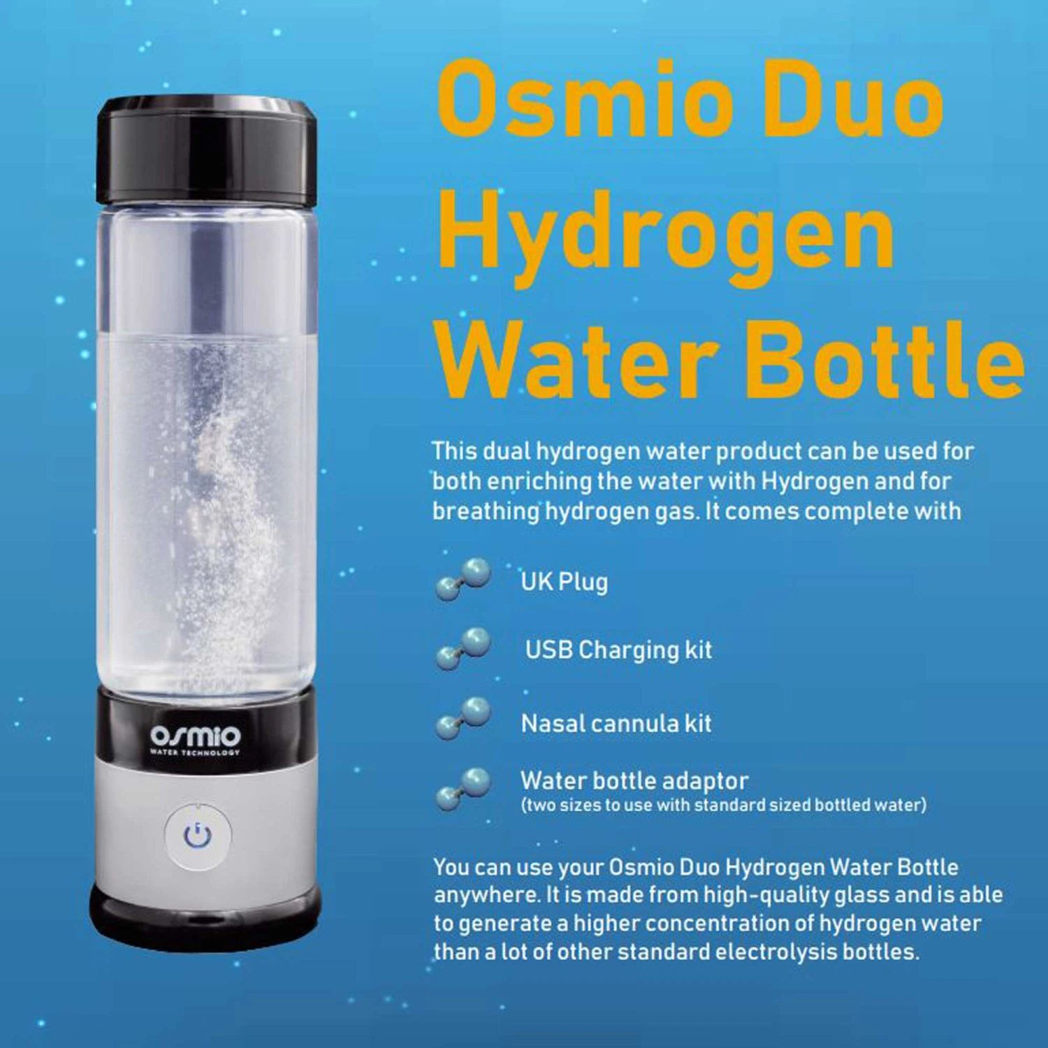 The product comes complete with UK Plug and USB Charging kit, and the nasal cannula kit. It also comes with additional accessories designed to enable you to attach a standard sized off the shelf PET plastic water bottle to the base so you can use the water in an alternative bottle to generate the hydrogen.