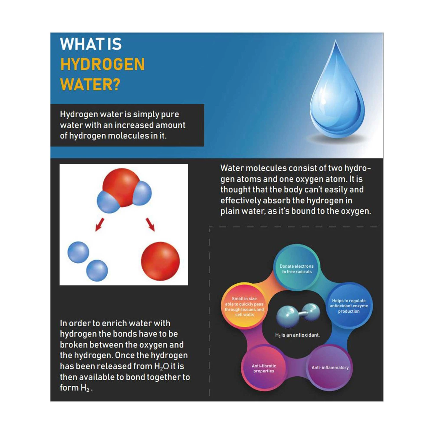 The Osmio Duo only puts, and can only ever put pure Hydrogen H2 gas into the water. Oxygen is separated out. This means any kind of water can be used (i.e. tap water, mineral water, spring water, filtered water, osmotic or distilled water). Please note that the quantity of h2 can vary depending on the level of dissolved solids (TDS) in your water, so the purer the water, the higher the levels of hydrogen that can be added.