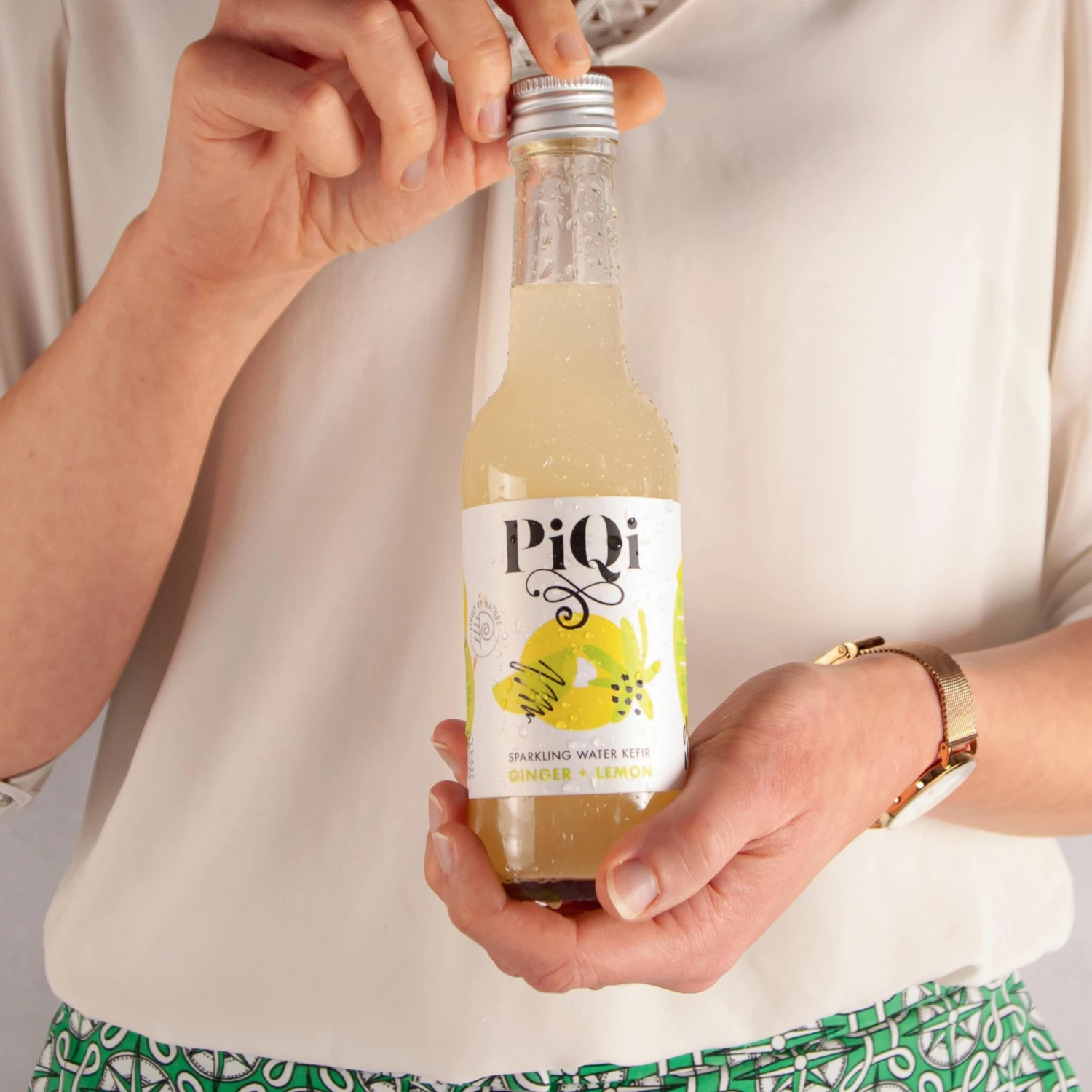 “Award-winning living fermented water kefir brewed in small batches in Devon. This invigorating kefir water is brewed with organic fiery ginger and organic lemon. A lively zesty thirst quencher with subtle lemon and citrus notes.  Water kefir is a fermented, raw living beverage that naturally contains live cultures. PiQi kefir water is raw and unpasteurised and requires refrigeration. “