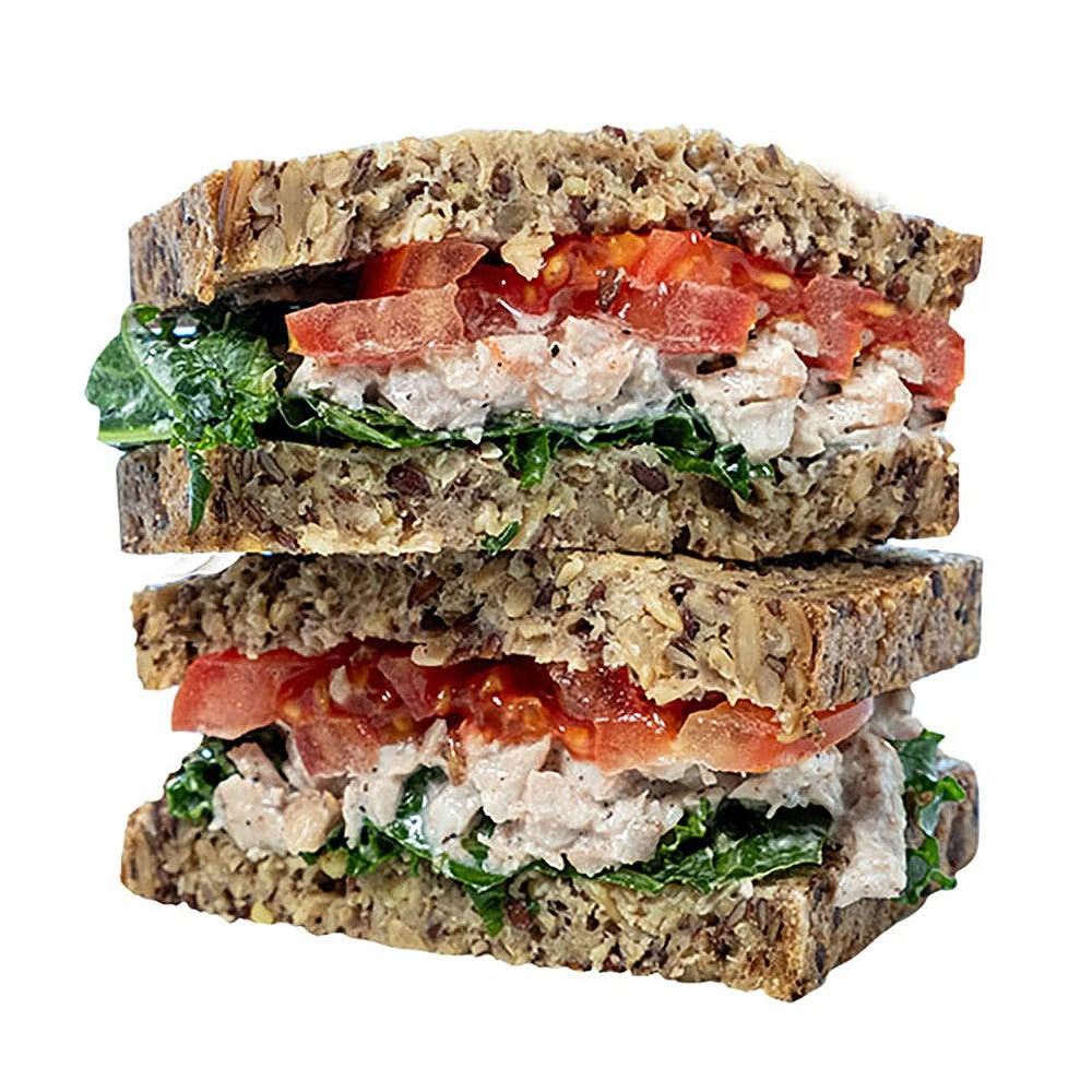 “A twist on a standard chicken caesar sandwich with kale and tomatoes on delicious wholesome, flour free, high fibre bread.”