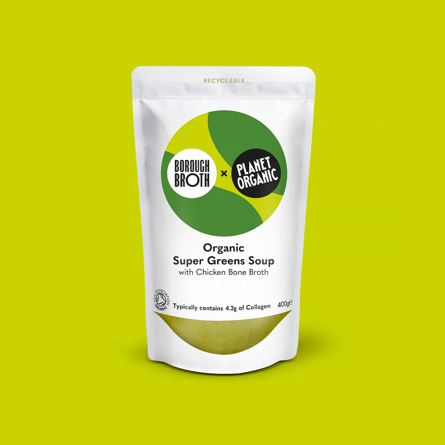Organic Super Greens Soup with Chicken Bone Broth made with 100% organic ingredients.