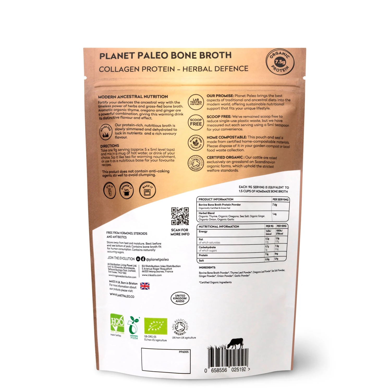 Explore the Planet Paleo Bone Broth Collagen range here. Planet Paleo Organic Bone Broth collagen powder is crafted from the highest quality organic grass-fed cattle in Scandinavia, slowly simmered to release all the powerful primal nutrients and dehydrated into a convenient, easy to use form. Herbal Defence Organic collagen powder bone broth provides a unique nutritional profile containing collagen protein, glucosamine, hyaluronic acid and minerals to support whole-body health. You can buy it as part of the Planet Paleo complete range here.