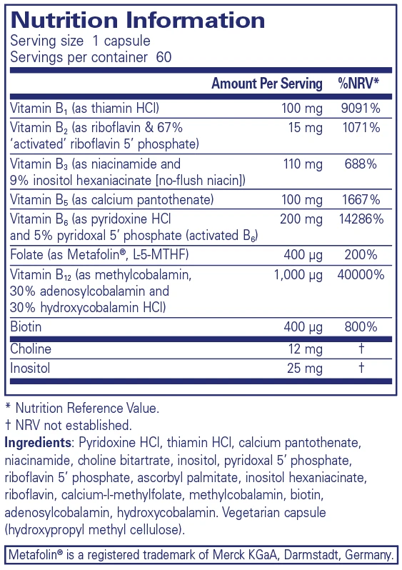 “B6 Complex provides active B6 with vitamin B12, folate, other B vitamins and nutrients. Vitamin B6 is provided as pyridoxine and the activated form pyridoxal-5-phosphate. Vitamin B12 is provided as a combination of adenosylcobalamin and hydroxycobalamin. Featuring folate as L-5-methyltetrahydrofolate (L-5-MTHF), the naturally occurring universally metabolised form of folate. Vitamin B6 contributes to normal functioning of the nervous system. Vitamin B6 contributes to the regulation of hormonal activity.”