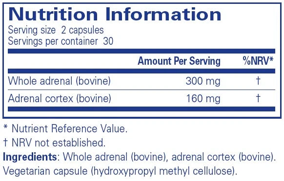 “Adrenal provides a blend of whole adrenal and adrenal cortex extracts. Each capsule provides 460mg of total adrenal concentrate and is free-free from additives, binders and fillers.”