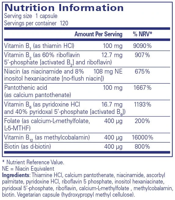 “B-Complex Plus offers a comprehensive blend of B vitamins packed into one easy-to-take supplement. Includes active forms of B vitamins, including pyridoxal-5-phosphate, riboflavin-5-phosphate and folate as 5-methyltetrahydrofolate (5-MTHF), the universally metabolized and biologically active form of folate. Vitamins B1, B3, and B6 contribute to normal functioning of the nervous system. Folate, vitamin B5 and B12 contribute to the reduction of tiredness and fatigue. “