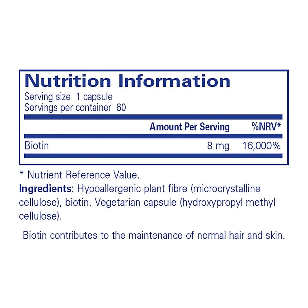 “Biotin 8 mg features biotin, a water-soluble B-vitamin that contributes to the maintenance of normal hair and skin. Biotin also contributes to normal psychological and nervous system function. Each vegetarian capsule provides 8 mg daily. “