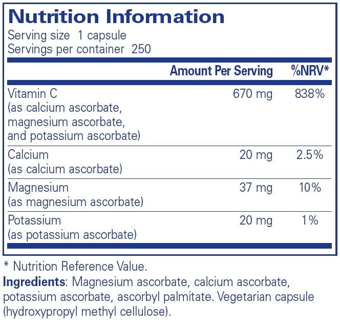 “Buffered Ascorbic Acid combines calcium ascorbate, magnesium ascorbate, and potassium ascorbate to create a neutral pH vitamin C for sensitive individuals. Vitamin C contributes to normal psychological function and functioning of the nervous system. Vitamin C contributes to the reduction of tiredness and fatigue. “