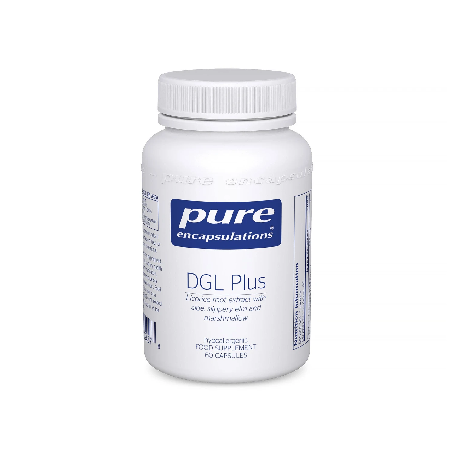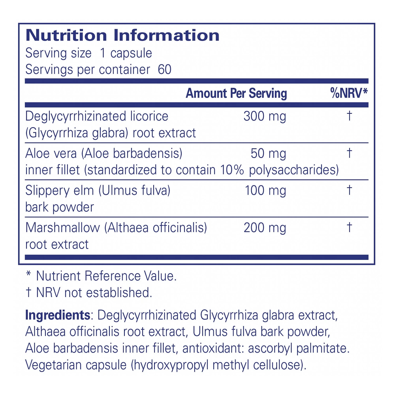 “Licorice root extract with aloe, slippery elm and marshmallow. DGL Plus features deglycyrrhizinated licorice (DGL) root extract. Provides 300 mg of DGL in each vegetarian capsule. With aloe inner leaf extract. Also providing slippery elm and marshmallow.”