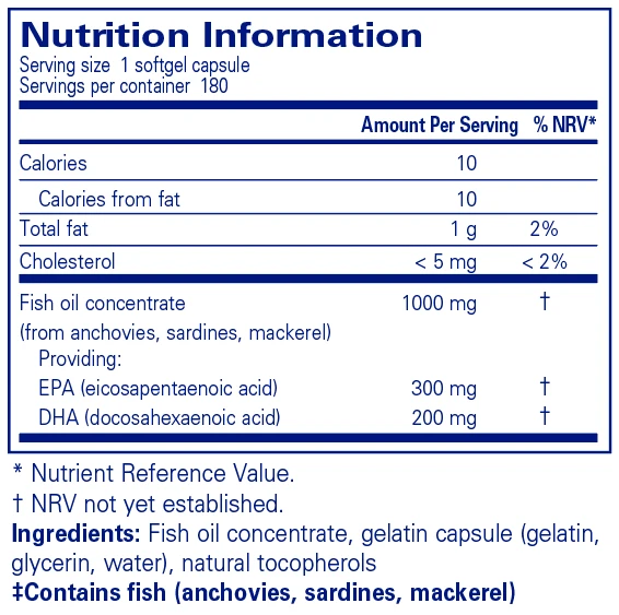 “Pure Encapsulations EPA/DHA Essentials is an ultra-pure, molecularly distilled fish oil concentrate that has been tested for environmental contaminants (heavy metals, PCBs, dioxins and furans), microbial contaminants, and oxidation and rancidity. It contains well below the strict limits for these criteria as established by the Council for Responsible Nutrition (CRN), Europea Pharmacoepeia (EP) and U.S. Pharmacoepeia (USP). DHA contributes to maintenance of normal vision and brain function. EPA and DHA contribute to the normal function of the heart.”