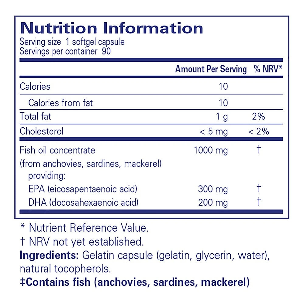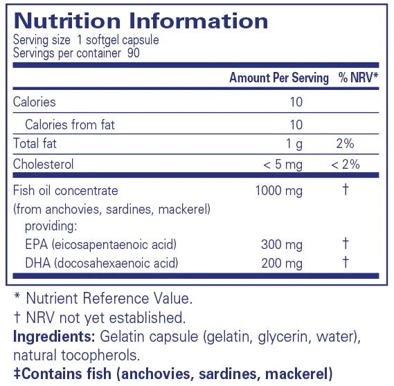 “EPA/DHA essentials is an ultra-pure, molecularly distilled fish oil concentrate that has been tested for environmental contaminants (heavy metals, PCBs, dioxins and furans), microbial contaminants, and oxidation and rancidity. It contains well below the strict limits for these criteria as established by the Council for Responsible Nutrition (CRN), Europea Pharmacoepeia (EP) and U.S. Pharmacoepeia (USP). DHA contributes to maintenance of normal vision and brain function. EPA and DHA contribute to the normal function of the heart.”