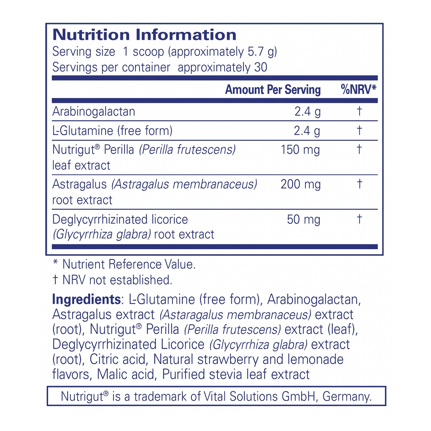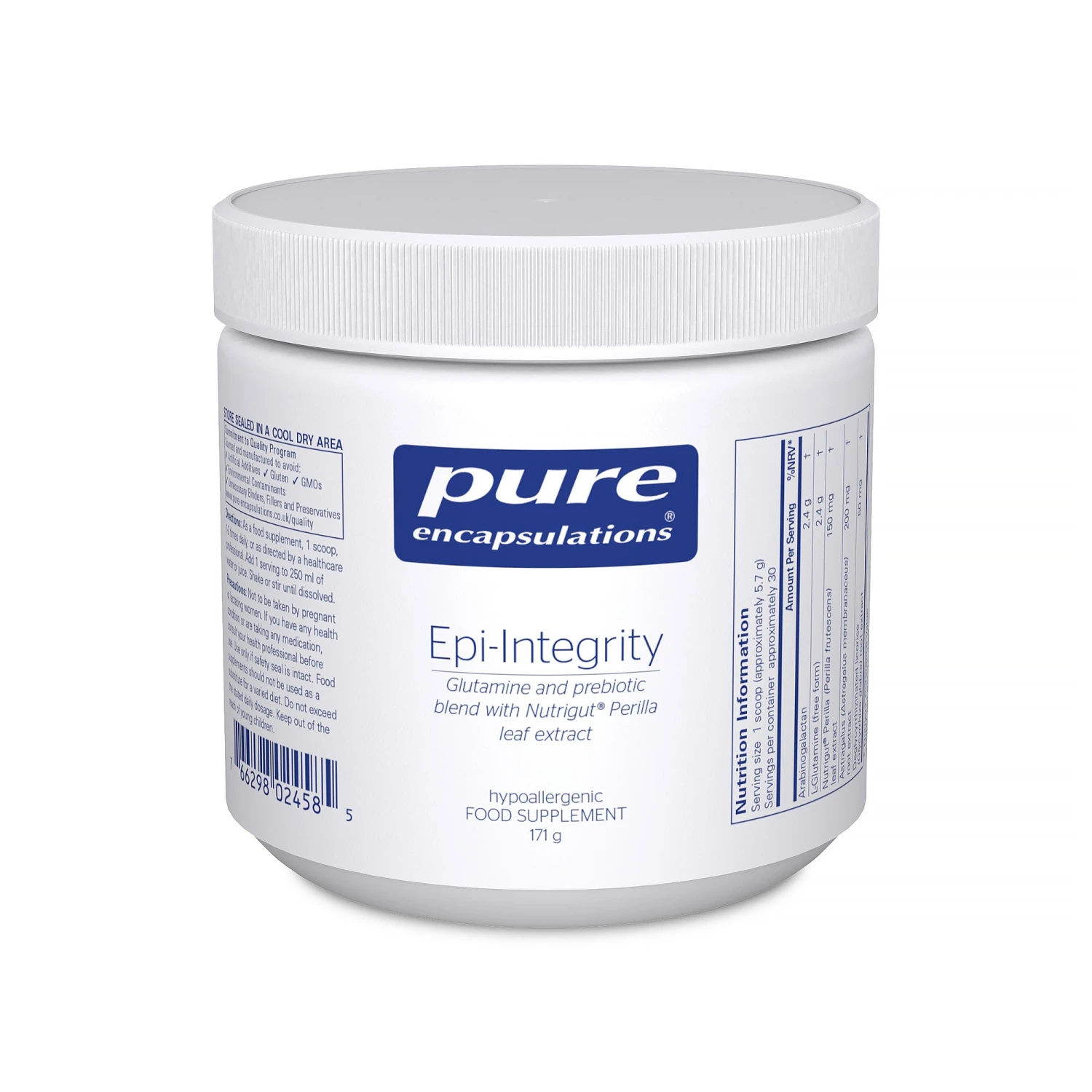 “Epi-Integrity provides a unique broad-spectrum combination of glutamine, prebiotics, and targeted botanicals that promote healthy gastrointestinal integrity and function in a great-tasting natural strawberry-lemonade flavoured powder. Featuring clinically studied Nutrigut® Perilla (Perilla frutescens) leaf extract. Providing 2.4 g of glutamine and 2.4 g of prebiotic arabinogalactan per serving. With astragalus and deglycyrrhizinated licorice (DGL) extracts.”