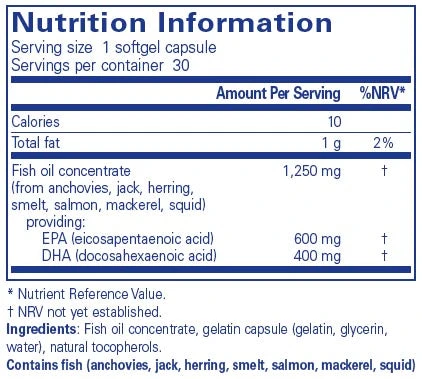 “ONE Omega provides 1,000 mg triglyceride-form EPA and DHA in each softgel. High potency formulation means less capsules are required. Features ultra-pure, molecularly distilled fish oil concentrate that contains well below the strict limits for environmental contaminants (heavy metals, PCBs, dioxins and furans), microbial contaminants, and oxidation and rancidity. DHA contributes to maintenance of normal vision and brain function. EPA and DHA contribute to the normal function of the heart. “