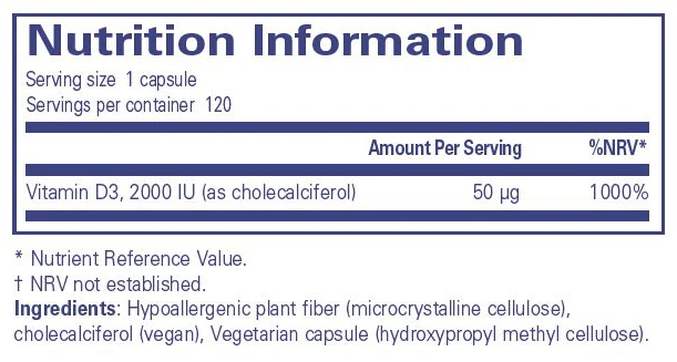 “Vitamin D3 (vegan) 2000 IU (50 ug) provides pure vitamin D as D3, the preferred form of vitamin D. Vitamin D contributes to the maintenance of normal muscle function and normal bones. Vitamin D also contributes to the normal function of the immune system.”