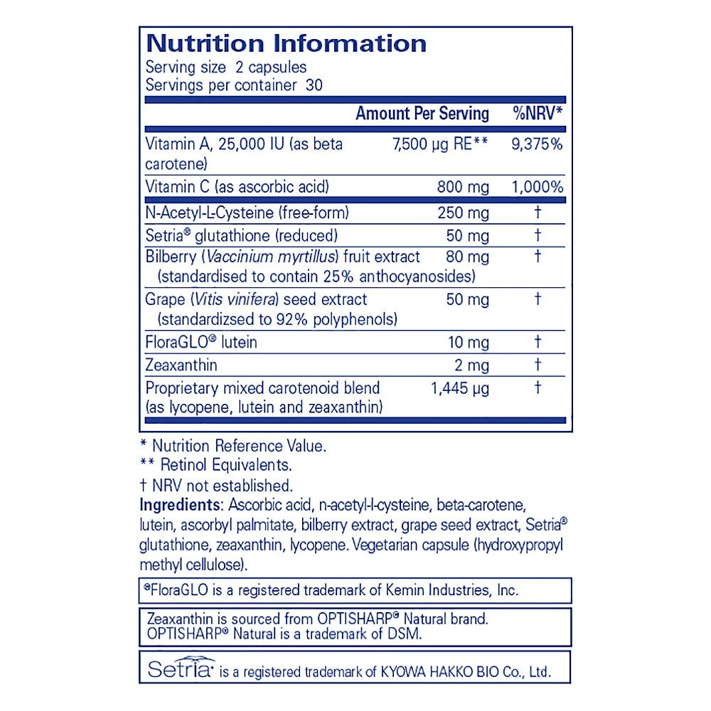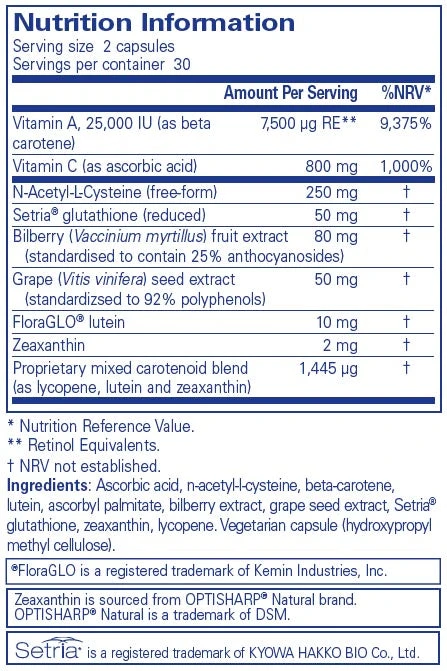 “Vision Support Formula is a blend of powerful nutrients and botanicals formulated with vitamin A to support healthy vision. Featuring lutein and zeaxanthin, the only two carotenoids found in macular pigment. Provides N-acetyl-l-cysteine and Setria® reduced glutathione. With high quality bilberry and grape seed extract. Vitamin C contributes to the protection of cells from oxidative stress”