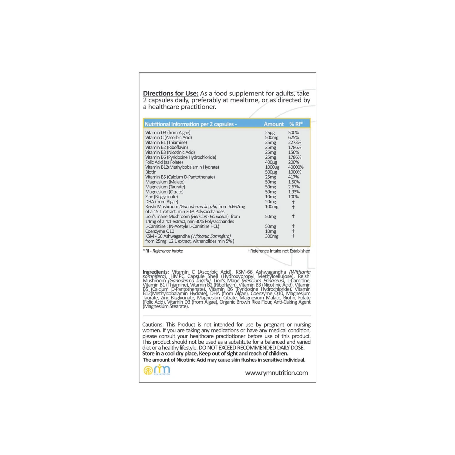 “RYM Brain Formula – Refresh & Energise capsules are designed with botanicals & nutrients to support your brain health in 5 ways- Sleep, Memory, Energy, Concentration and Mood. RYM botanical extracts contain the highest levels of active bio ingredients in the most potent form obtained through modern extraction technologies. They are unique fusion of Vitamin B-complex with high B12, Vitamin C, Vitamin D3, Zinc, triple Magnesium complex, L-Carnitine, Coenzyme Q10, Vegan DHA, Reishi & Lions mane Mushroom plus KSM-66 Ashwagandha.”