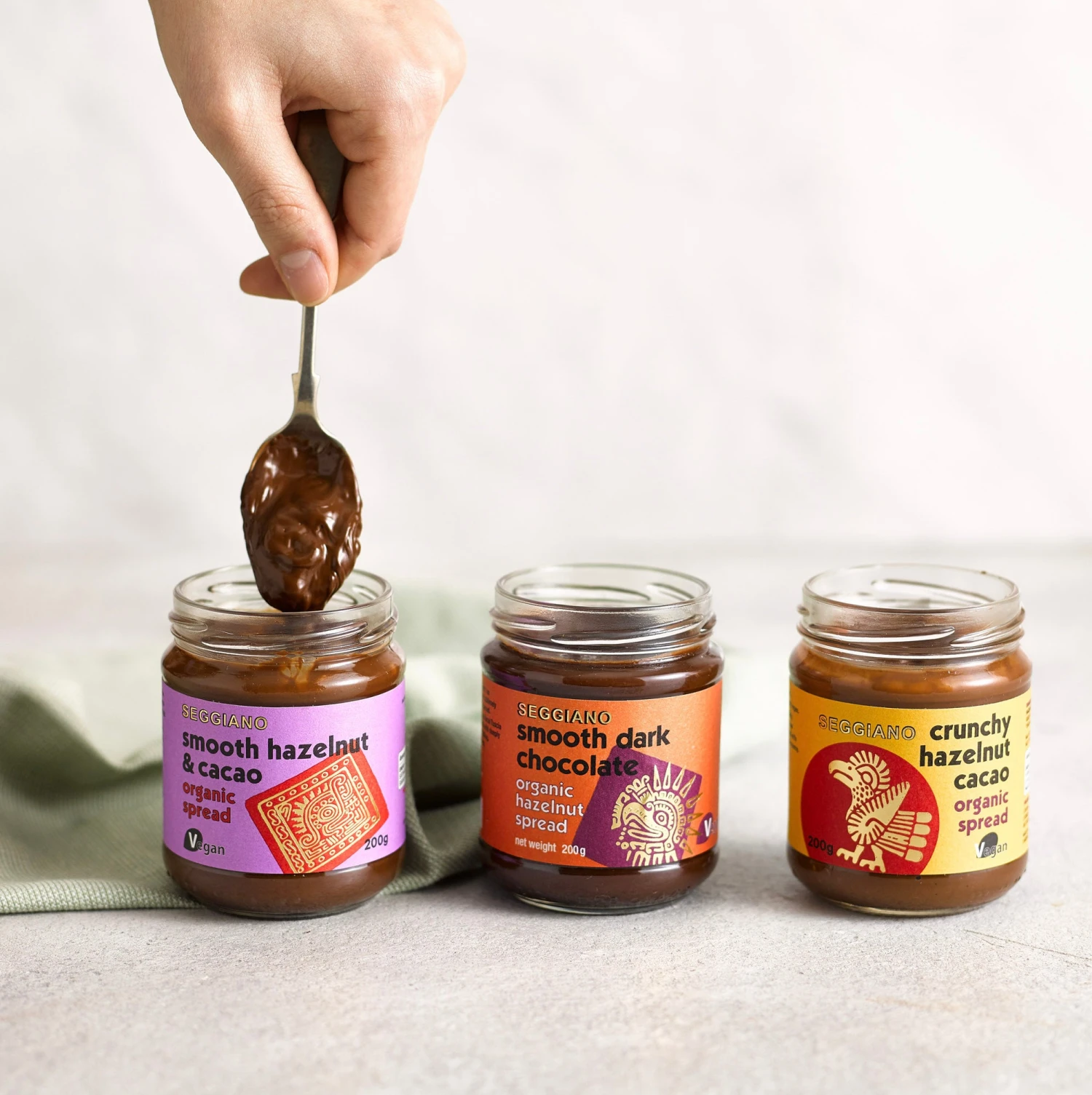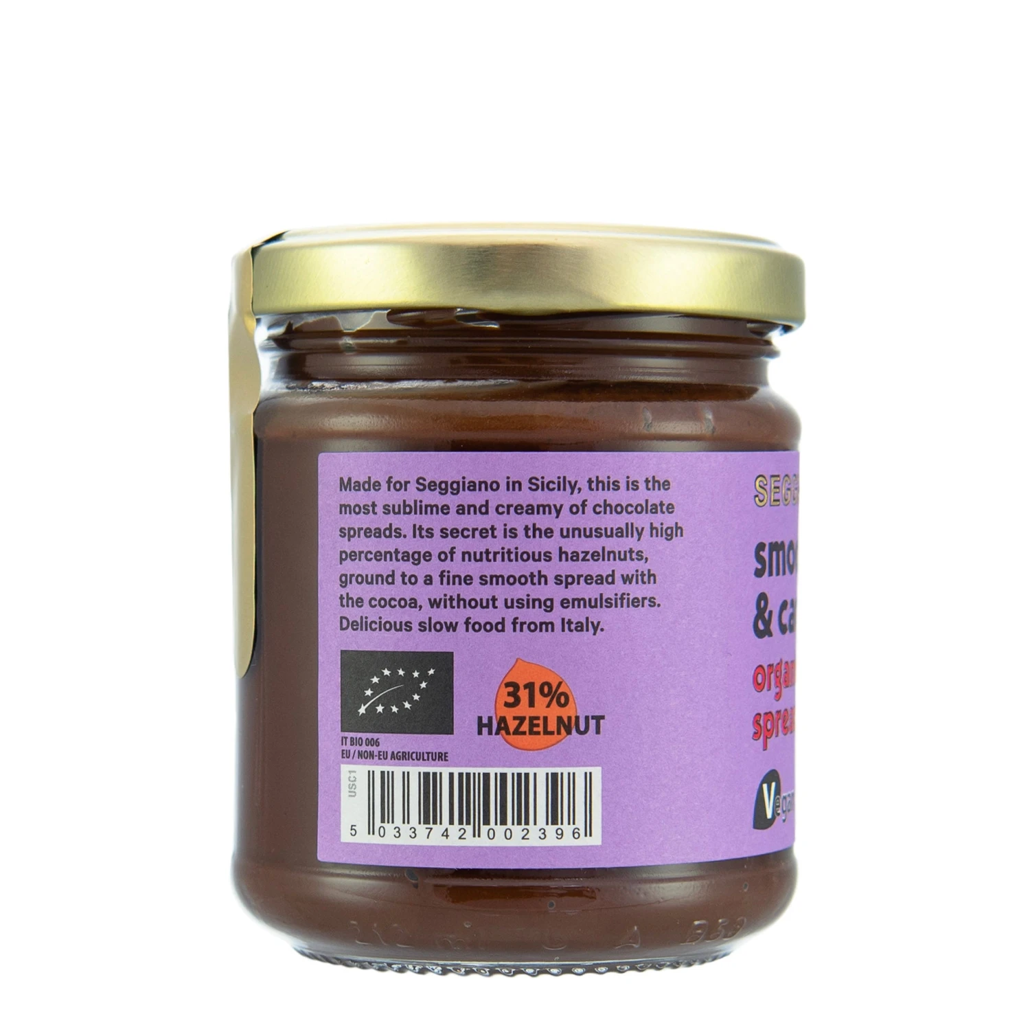 “Made for Seggiano in Sicily, this is the most deliciously smooth and creamy of chocolate nut spreads. Its secret is grinding the unusually high percentage of nutritious local hazelnuts to a fine smooth spread with the cocoa,without using emulsifiers. All of our three cacao spreads are both vegan and organic and contain a significantly higher proportion of hazelnuts, compared to market competitors which use oil as their primary ingredients. “