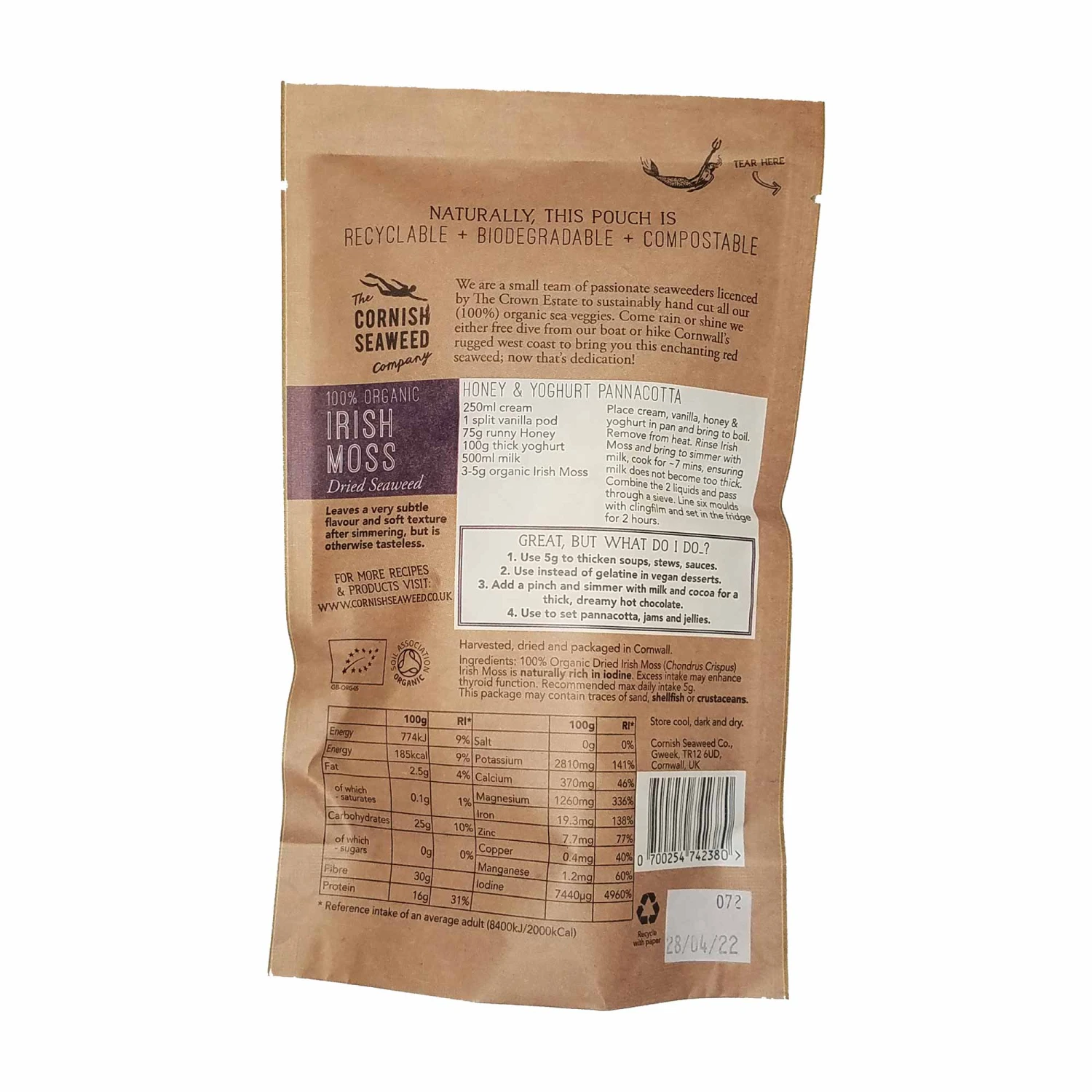 “This hand-harvested Irish Moss (also called Carrageen) is primarily used as a vegan alternative to gelatine, a thickener for soups, stews and sauces and to make tea with to act as a cough medicine.It can also be applied on the skin to soothe burns, moisturise and it is known to prevent acne and eczema. Air dried and bleached, there is no flavour to it, and a mildly sweet smell.”