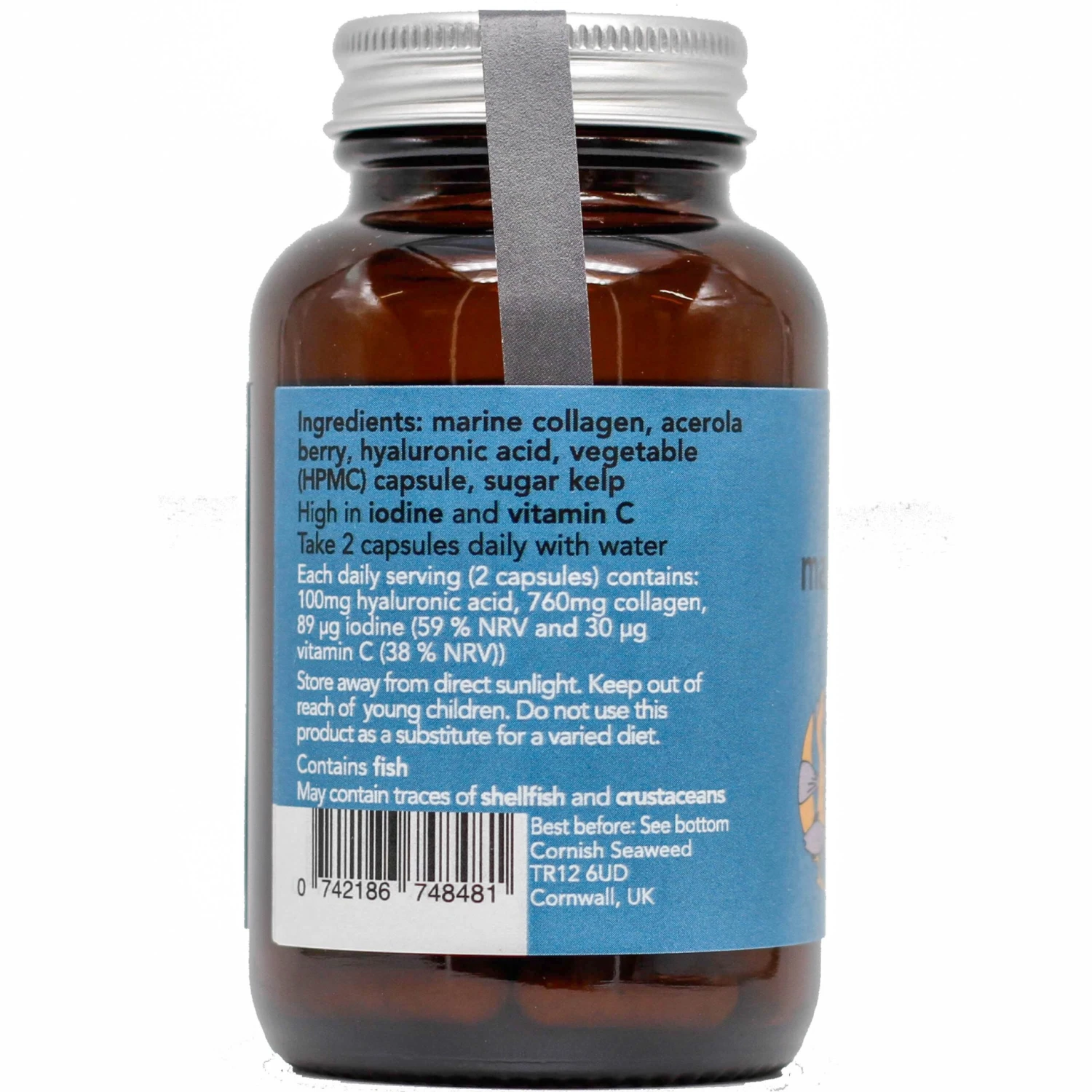 “Natural food supplement. Containing a powerful blend of Marine Collagen and Hyaluronic Acid, Acerola Berry and Seaweed. With age the body’s ability to maintain skin elasticity and bone health reduces. Marine Collagen contains naturally occurring Hyaluronic Acid and Vitamin C which contribute to normal collagen formation for the normal function of bones, skin, cartilage, gums and teeth, helping to support the body’s transitions through the ages.”