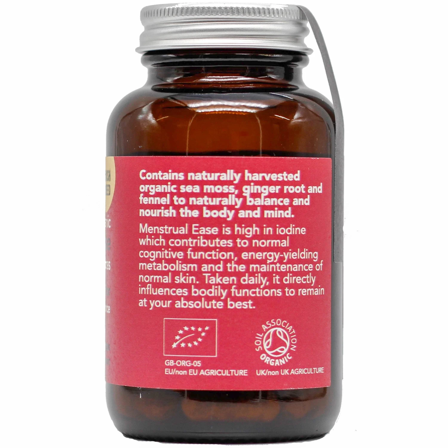 “Organic food supplement. Contains naturally harvested organic sea moss, ginger root and fennel to naturally balance and nourish the body and mind. Menstrual Ease is high in iodine which contributes to normal cognitive function, energy-yielding metabolism and the maintenance of normal skin. Taken daily, it directly influences bodily functions to remain at your absolute best.”