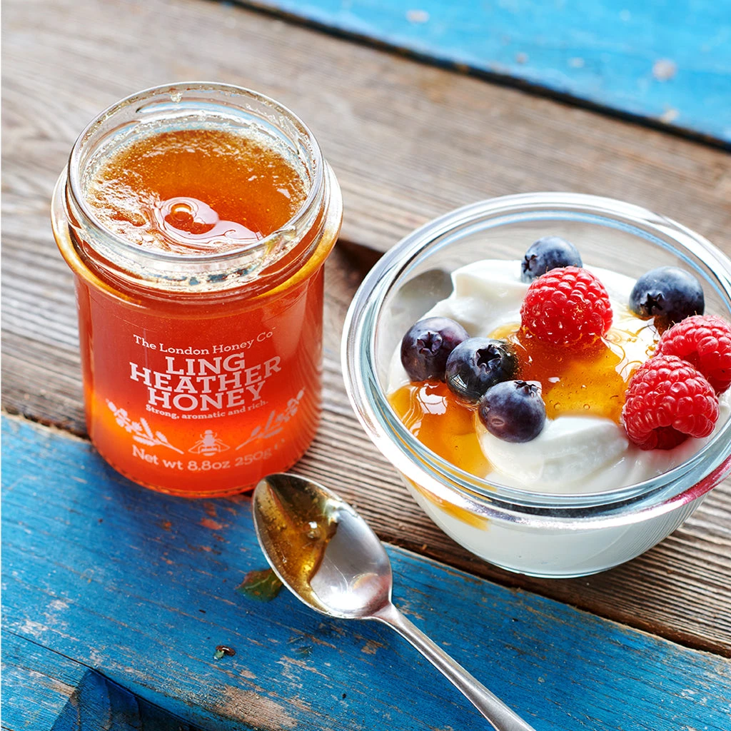 “Strong and aromatic, ling heather honey is highly prized. It has a jelly-like consistency which distinguishes it from other honey. Collected from London Honey Company beehives on the Long Mynd in Shropshire, after the late summer floral bloom of heather. This honey is amazing with yoghurt and fruit, or to make granola with for a fantastic weekend treat. The London Honey Company’s honey is always unpasteurised and minimally filtered. Hive Location: Shropshire, UK Beekeeper: Steve Benbow”