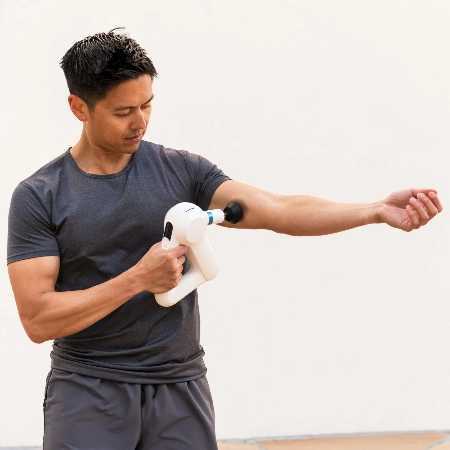 Theragun Elite in white is elegantly designed, lightweight, and fully personalised for your body’s needs.