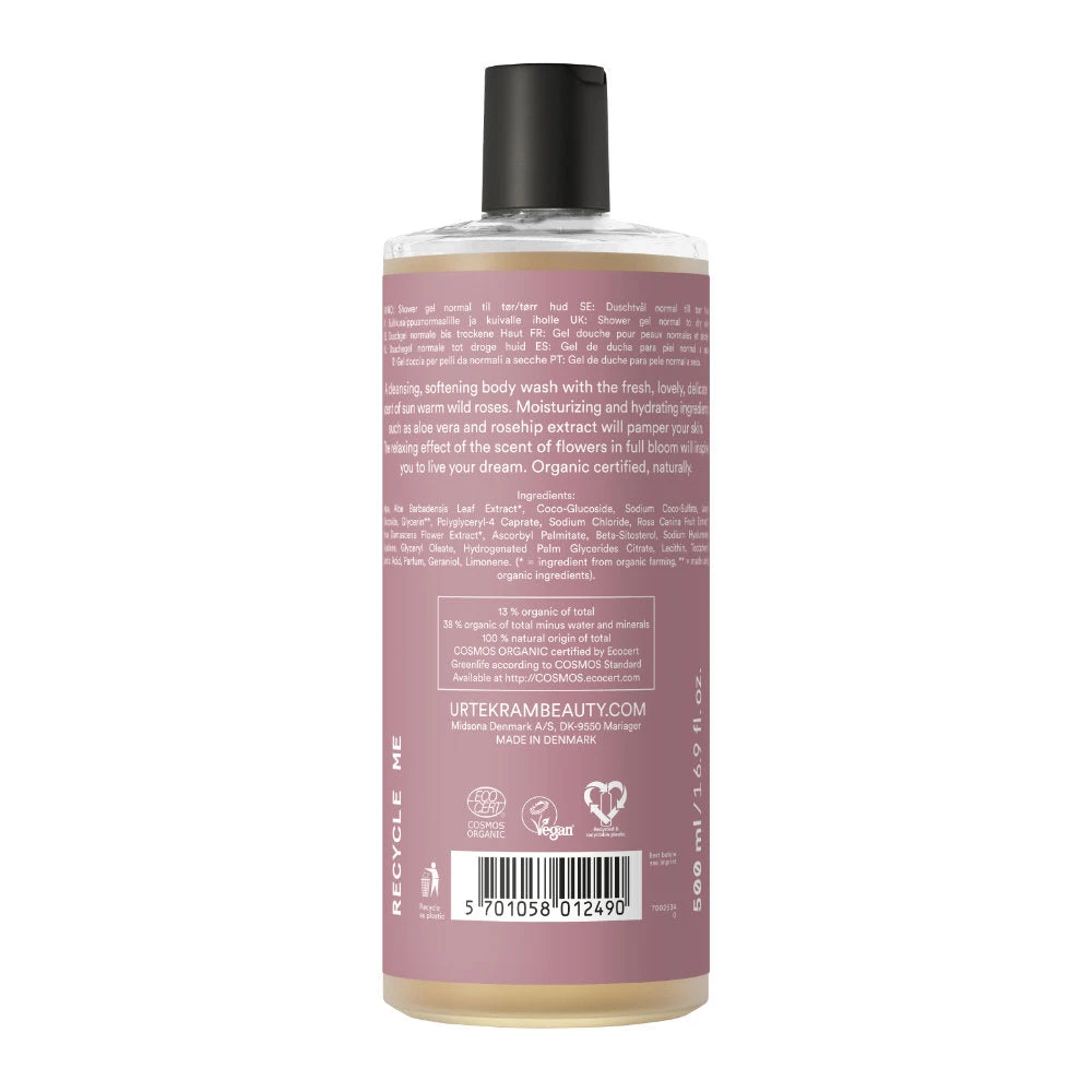 “A cleansing, softening body wash with the fresh, lovely, delicate scent of sun warm wild roses. Moisturising and hydrating ingredients such as aloe vera and natural oils will pamper your skin. The relaxing effect of the scent of flowers in full bloom will inspire you to live your dream. Organic certified, naturally.”